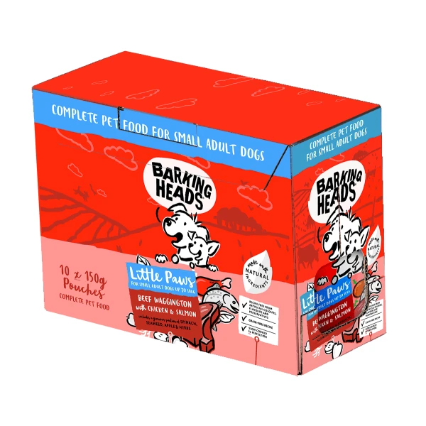 Part of our special range for Little Paws, Barking Heads Beef Waggington with Chicken & Salmon is lovingly made for the palate of a petite pooch who we all know can be a tad fussy! We mix this recipe with loads of quality, natural grass-fed beef, chicken & salmon and add a generous portion of fruit & vegetables such as spinach, apple & seaweed, for a slow-cooked taste sensation that will satisfy even the most discerning tastebuds. We’ve even added a special blend of vitamins & minerals to ensure that your Little Paws has a complete and balanced bowl-full that’s approved by leading vet Dr. Scott Miller. What’s more, we’ve even made this recipe grain-free to help support healthy digestion, in case of sensitive little tummies. With no fillers or nasties, it’s truly a feast for even the very fussiest amongst our canine customers! Recommended for small breed dogs of up to 10kg.