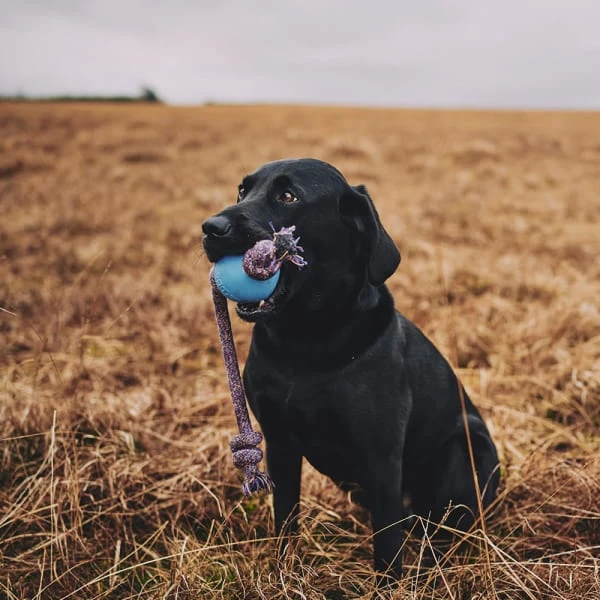 Going the distance to keep your dog leaping to the sky. A natural rubber ball on a strong but soft to touch recycled cotton rope. The natural rubber is super tough, and the rope makes it easy to throw; ideal for a game of fetch.Â