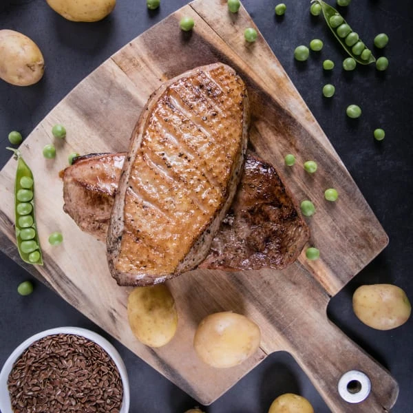 Fresh duck: 55%, Potatoes: 24%, Peas: 10%, Duck fat: 3%, Duck stock: 2%, Brewer’s yeast: 1%, Beet pulp: 1%, Linseed: 1%, Sunflower oil: 0.6%, Minerals, Vitamins, Yucca schidigera extract: 0.3%, Fos: 0.1%, Mos: 0.1%.