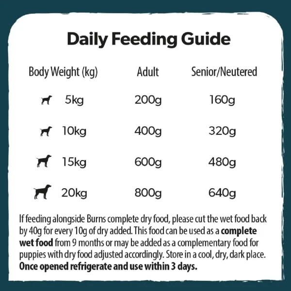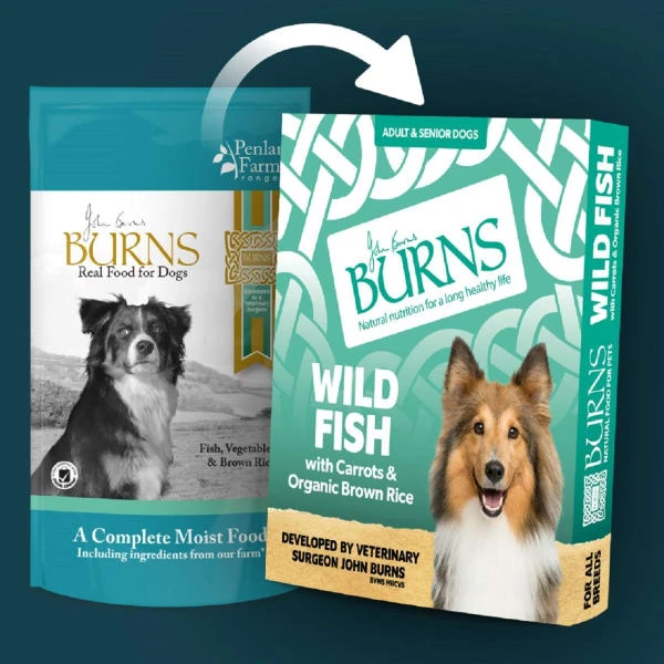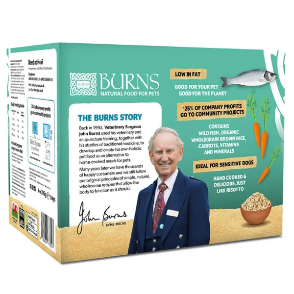 Using sustainably sourced white fish, the Burns Wild Fish with Carrots & Organic Brown Rice is hand-cooked in Wales and the perfect convenient alternative to home cooking. This wholesome recipe is natural, hypoallergenic, gluten free and low in fat, making it suitable for adult and senior dogs of any breed, fussy eaters, sensitive dogs and dogs that have pancreatitis. Previously known as Penlan Farm, our complete wet food contains wild fish, organic wholegrain brown rice, carrots, fish oil, sunflower oil, vitamins and minerals, with no hidden surprises, ensuring your dog is getting only the very best.
