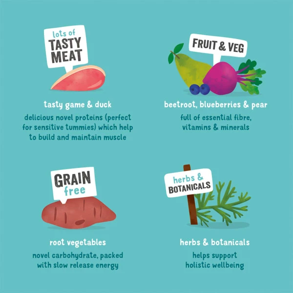 We only use fresh meat in our kibble – meaning nothing processed or dried, and absolutely no meal or bone. By mixing in a few tasty extras, like lots of healthy fruit, veg and berries, we’ve created a well-balanced kibble that gives dogs everything they need. Carefully baked at a low temperature, we lock in the goodness and make it easily digestible. Packaged in 100% biodegradable bags, its naturally tasty dog food that you, your pets and our planet can feel good about.