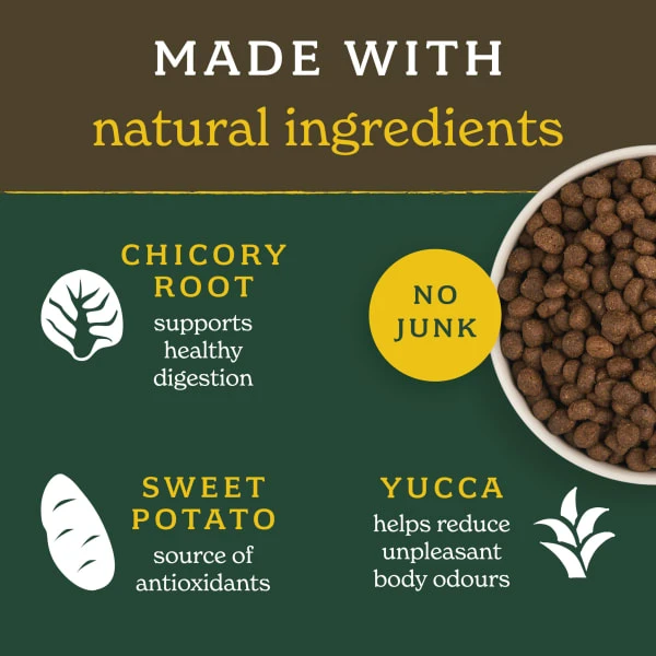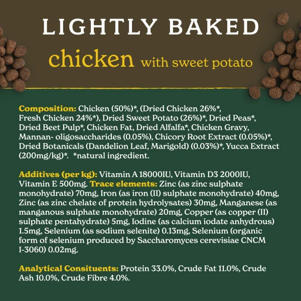 Our Lightly Baked natural dry dog food is bursting with goodness and made using natural ingredients along with vitamins and minerals. 50% Chicken and grain free recipe making the food perfect for even the most sensitive of tummies. Suitable for dogs 1 year +.