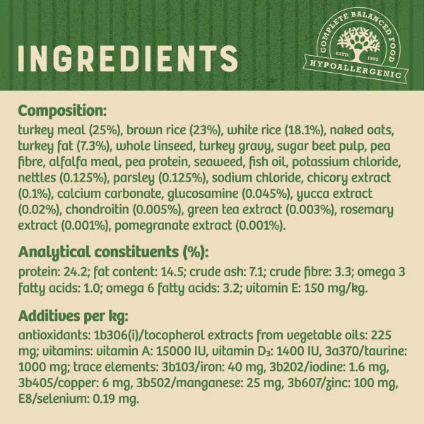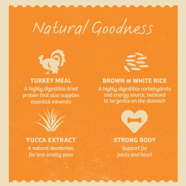 We’ve taken a handful of nature’s nourishing ingredients and combined them with flavourful turkey for highly digestible, quality protein. Then, using all our knowledge and experience, we’ve added all the vitamins and minerals your pet needs to stay happy, healthy and full of life.