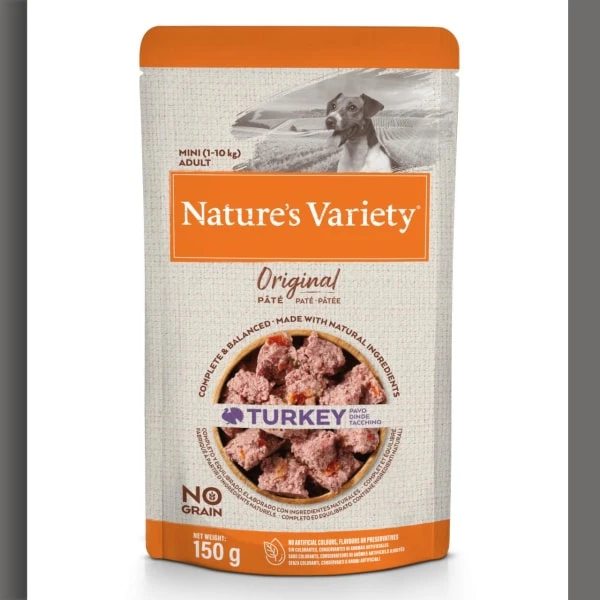 Our Original Pâté recipes are made with premium natural ingredients. Quality meat from our suppliers blended with fruit and vegetables selected for their nutritional properties, all gently steam cooked in the single-serve pouch to lock-in all the goodness. Free from grain and with no artificial flavours, colours or preservatives. All of our complete and balanced meals are veterinary approved and made to PFMA and FEDIAF guidelines. Store Nature’s Variety dog food pouches in a cool dry place. After opening keep refrigerated for max. 2 days. Serve at room temperature. Clean fresh water should be available in a clean bowl at all times.