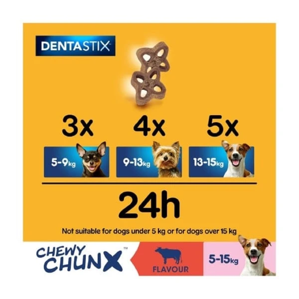 - These tasty dentastix dog dental sticks are suitable for dogs from 5 – 15kg