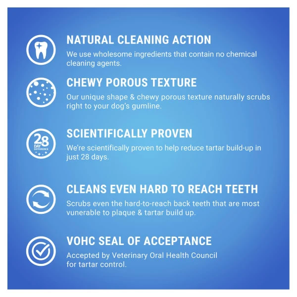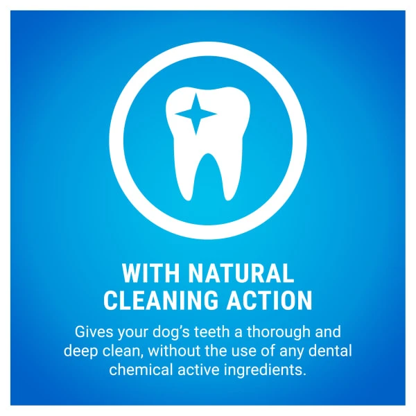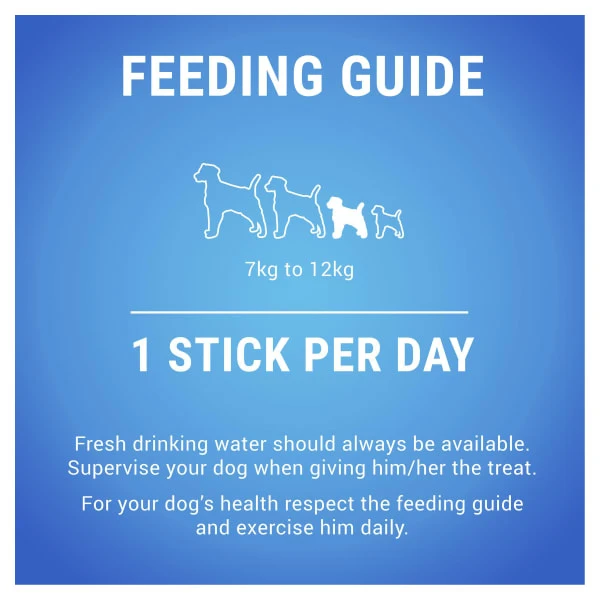 Dental chews for dogs, given once daily will help to reduce tartar build-up. These tasty sticks are made from wholesome ingredients and contain vitamin D and calcium. The ridges massage the gumline while the chewing action will clean even the hard to reach teeth. They are low in fat with no added sugar, flavours or colours.