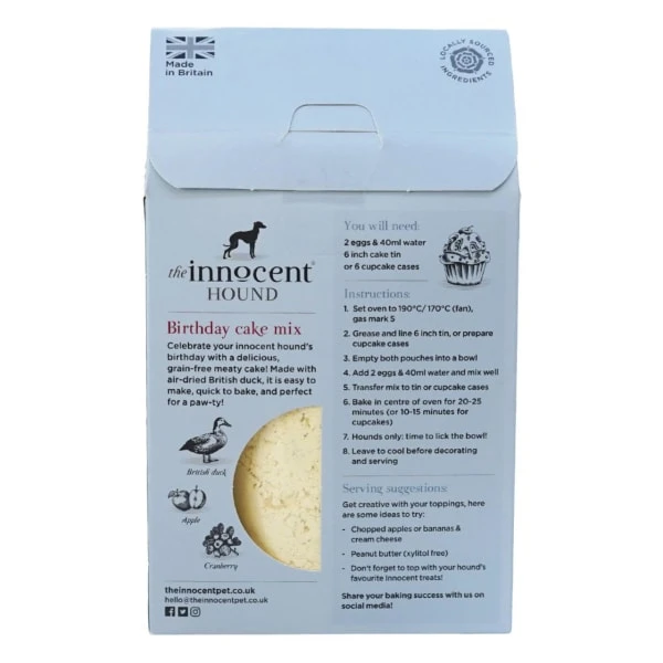 Celebrate your innocent hound’s birthday with a delicious grain-free meaty cake! Simply combine the contents of the 2 sachets with 2 eggs and water, pour into a cake tin or cupcake cases, and bake! Decorate with your hound’s favourite toppings such as cream cheese or peanut butter (xylitol free).
